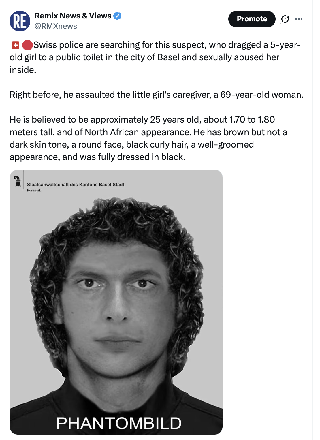 Europe has been plagued by foreigners and their appetite for sexual crimes, which have often targeted minors. Police are still looking for the suspect below in neighboring Switzerland. Remix News is providing a screenshot since the post on X has been censored and cannot be embedded on our website.