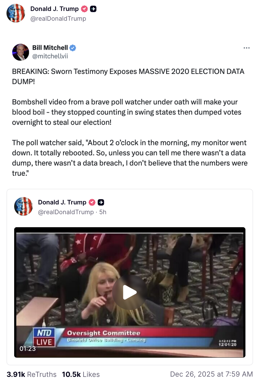 Image Credit: @mitchellvii / X screenshot On Friday President Donald Trump reposted a report from host of YourVoice America, Bill Mitchell, regarding the stolen 2020 election. The report featured a video recorded on December 1, 2020 of a poll watcher giving sworn testimony to the state Oversight Committee in Lansing, Michigan.