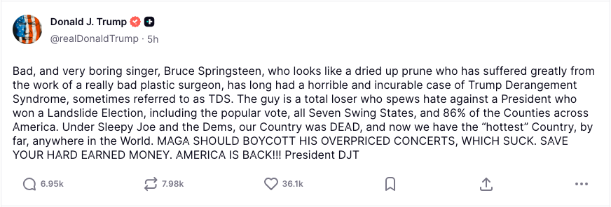 Hot off his speech giving Americans an update on the Iran war, Trump took to Truth Social fuming against the 76-year-old “Born In The USA” singer, who just days ago launched his latest anti-Trump themed tour.
