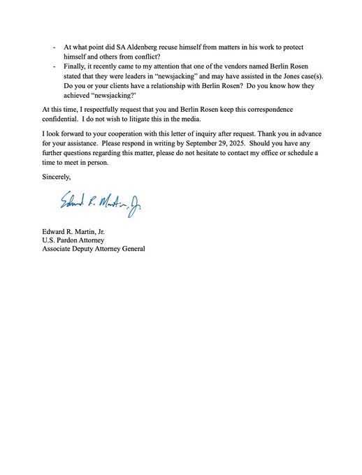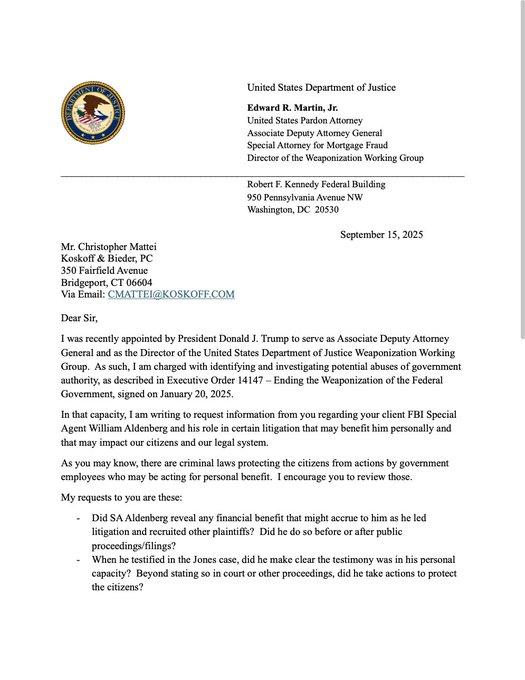 Martin wrote, “I am writing to request information from you regarding your client FBI Special Agent William Aldenberg and his role in certain litigation that may benefit him personally and that may impact our citizens and our legal system. As you may know, there are criminal laws protecting the citizens from actions by government employees who may be acting for personal benefit. I encourage you to review those.”