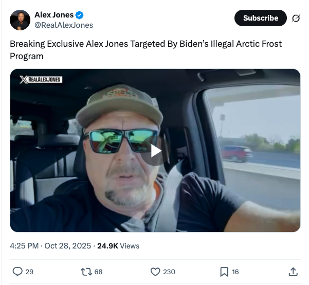 — Alex Jones (@RealAlexJones) October 28, 2025