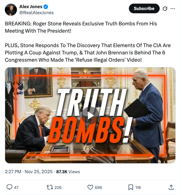 — Alex Jones (@RealAlexJones) November 25, 2025