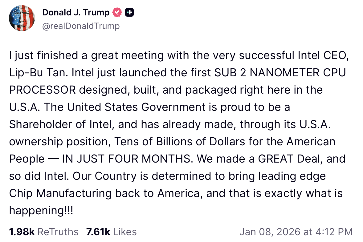 I just finished a great meeting with the very successful Intel CEO, Lip-Bu Tan. Intel just launched the first SUB 2 NANOMETER CPU PROCESSOR designed, built, and packaged right here in the U.S.A. The United States Government is proud to be a Shareholder of Intel, and has already made, through its U.S.A. ownership position, Tens of Billions of Dollars for the American People — IN JUST FOUR MONTHS. We made a GREAT Deal, and so did Intel. Our Country is determined to bring leading edge Chip Manufacturing back to America, and that is exactly what is happening!!!