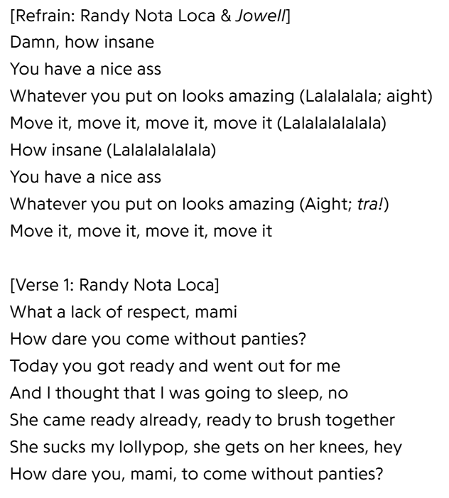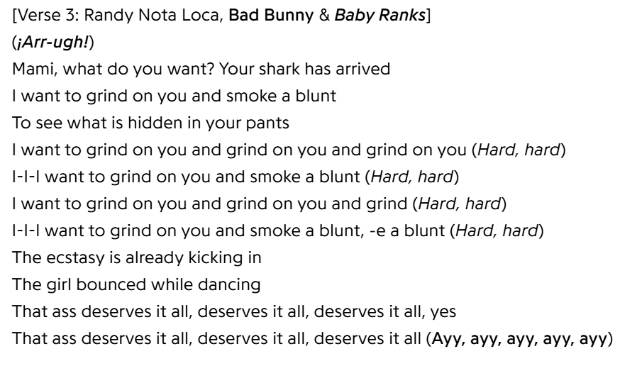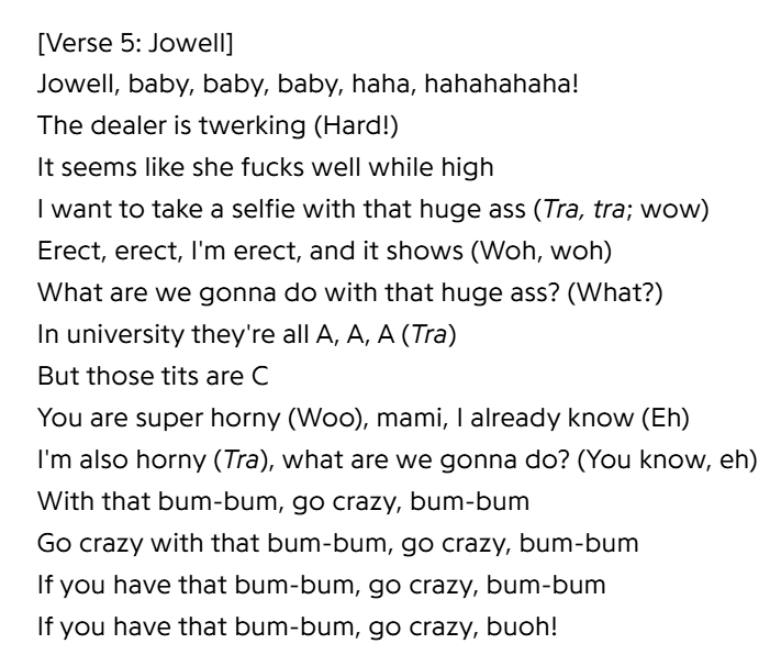 - “I go down on her and she gets happy. She’s glammed up and just turned 30. Come on, baby, get close (Ah!), turn around. If I kiss you and you grab it, then I’m taking you with me. Hey, I’ll touch you while dancing, girl, I’m testing (Come on), hey. Bring your bestie (Ooh) and we’ll take both your panties down (Tra)”