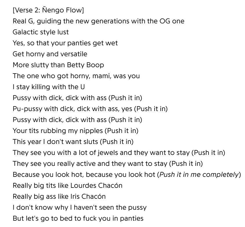 - “She wants to grind and get high. I’ll smack that ass. Whenever you want, ready for you to gеt horny. And to grind it with you all-all night. There are so many seats. And you still want to sit on top of my dick. I’ve made your pussy sentimental, uh. And your panties are wet. Pretty nasty foreplay (Uh-huh) A real booty, but her boobs are plastic. Before it gets in she spits on it (Mami) I made her ride it and on the bed, we had a— (Ya!)”