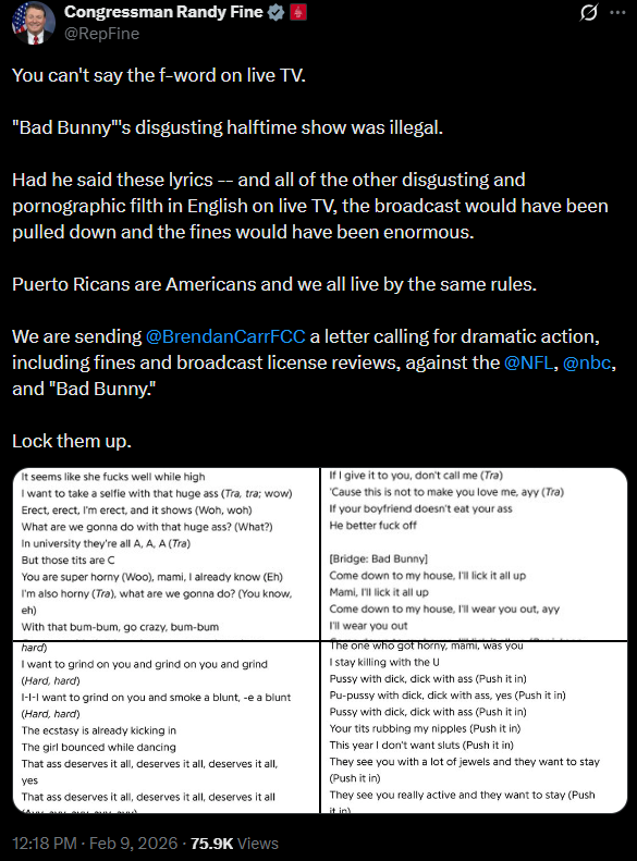 Image Credit: Kindell Buchanan - PA Images / Contributor / Getty Update: Congressman Randy Fine (R-Fla.) called on the FCC to take action against the NFL, NBC and Bad Bunny for airing the “illegal” content.