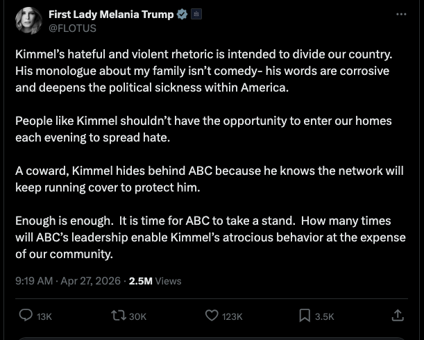 “Kimmel’s hateful and violent rhetoric is intended to divide our country. His monologue about my family isn’t comedy- his words are corrosive and deepens the political sickness within America,” the First Lady wrote. “People like Kimmel shouldn’t have the opportunity to enter our homes each evening to spread hate.”