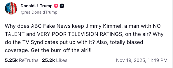 President Trump has frequently called on ABC to take Kimmel off the air, predicting he would be the next late night host to go after CBS announced it would be canceling The Late Show with Stephen Colbert.