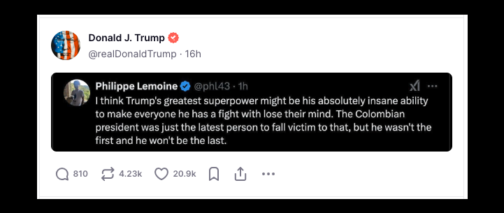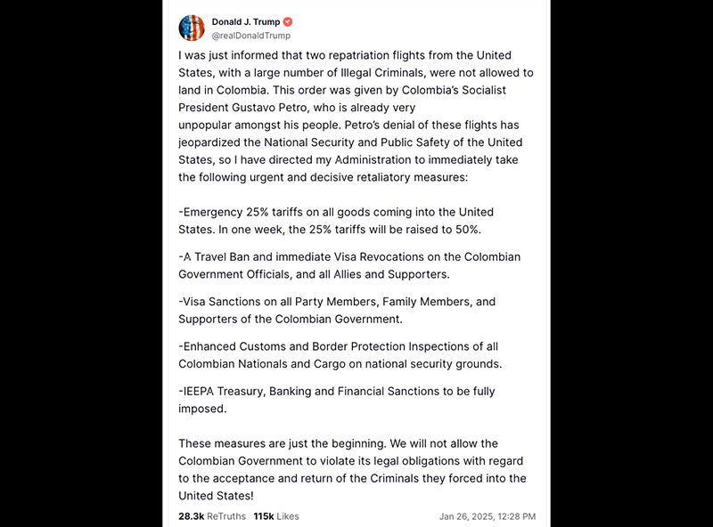 The incident unfolded on Sunday, with Trump announcing Colombia had denied two repatriation flights, prompting him to respond by saying he would impose “emergency” tariffs starting at 25% and soon increasing to 50%.