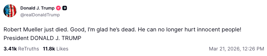“Robert Mueller just died,” Trump wrote on Truth Social on Saturday afternoon, adding, “Good, I’m glad he’s dead. He can no longer hurt innocent people!”