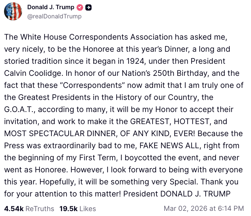 The White House Correspondents Association has asked me, very nicely, to be the Honoree at this year’s Dinner, a long and storied tradition since it began in 1924, under then President Calvin Coolidge. In honor of our Nation’s 250th Birthday, and the fact that these “Correspondents” now admit that I am truly one of the Greatest Presidents in the History of our Country, the G.O.A.T., according to many, it will be my Honor to accept their invitation, and work to make it the GREATEST, HOTTEST, and MOST SPECTACULAR DINNER, OF ANY KIND, EVER! Because the Press was extraordinarily bad to me, FAKE NEWS ALL, right from the beginning of my First Term, I boycotted the event, and never went as Honoree. However, I look forward to being with everyone this year. Hopefully, it will be something very Special. Thank you for your attention to this matter! President DONALD J. TRUMP