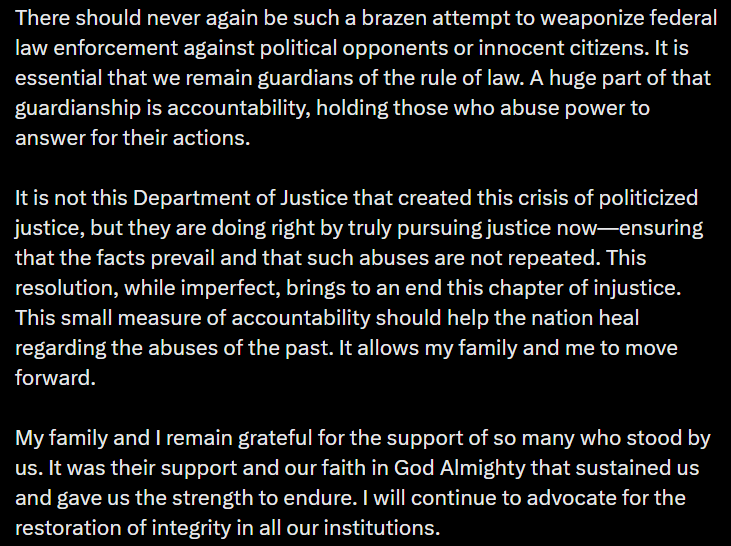 He added, “This ordeal stemmed from partisan government officials in a coordinated effort to pursue an innocent man as part of a broader campaign to undermine. Donald Trump and his administration. It was a relentless, partisan pursuit that weaponized federal law enforcement in an audacious and unjust manner. Yet this settlement goes far in demonstrating that the current Department of Justice, under the leadership of President Trump, Attorney General Bondi, Deputy Attorney General Blanche, and other dedicated departmental leaders, is committed to bringing accountability for the bad acts of those partisan actors. It marks a meaningful step toward righting a profound wrong.”