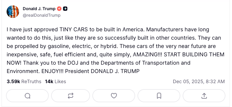 On Friday, President Trump also declared he’d just approved inexpensive, fuel-efficient “TINY CARS,” like those built in Asia, to be built in America, instructing auto manufacturers to “START BUILDING THEM NOW!”