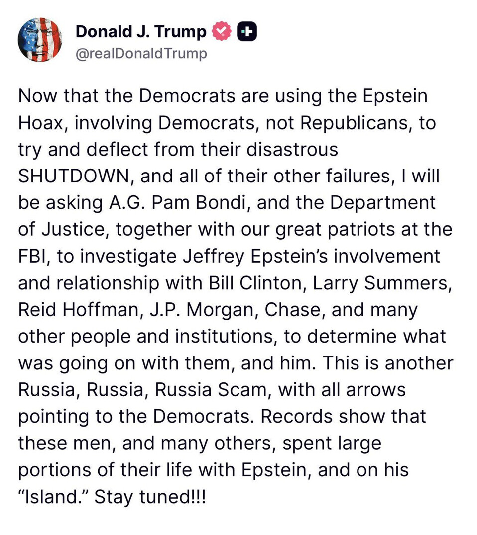Over the past few months, Trump has insisted the imminent Epstein file release would be more damaging for Democrats like Bill Clinton, Obama Treasury Sec. Larry Summers, venture capitalist Reid Hoffman and others, last week directing Attorney General Pam Bondi to investigate Epstein’s involvement with them and major banking institution JPMorgan Chase & Co.