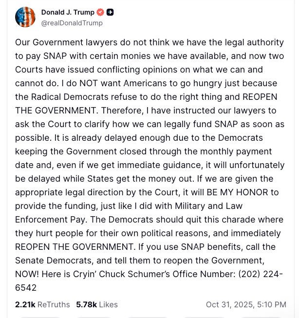 “Therefore, I have instructed our lawyers to ask the Court to clarify how we can legally fund SNAP as soon as possible,” President Trump wrote, noting, “It is already delayed enough due to the Democrats keeping the Government closed through the monthly payment date and, even if we get immediate guidance, it will unfortunately be delayed while States get the money out.”