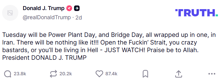 On Sunday, President Trump warned Iran, “Tuesday will be Power Plant Day, and Bridge Day, all wrapped up in one, in Iran. There will be nothing like it!!! Open the Fuckin’ Strait, you crazy bastards, or you’ll be living in Hell – JUST WATCH! Praise be to Allah. President DONALD J. TRUMP.”