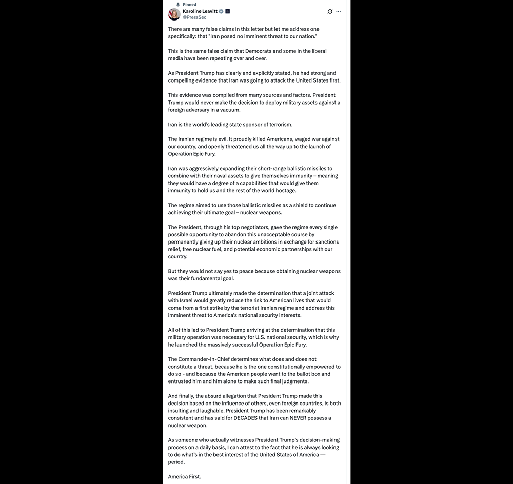 “After carefully reviewing all the information before him, President Trump concluded that the terrorist Islamist regime in Iran posed an imminent threat and he took action based on that conclusion.”
