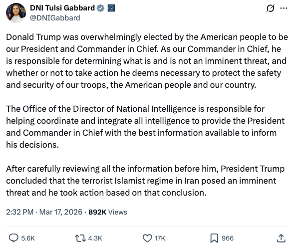 Addressing Kent’s claims, DNI Gabbard released a statement backing Trump’s assessment of Iran as an imminent threat, saying, “As our Commander in Chief, he is responsible for determining what is and is not an imminent threat, and whether or not to take action he deems necessary to protect the safety and security of our troops, the American people and our country.”