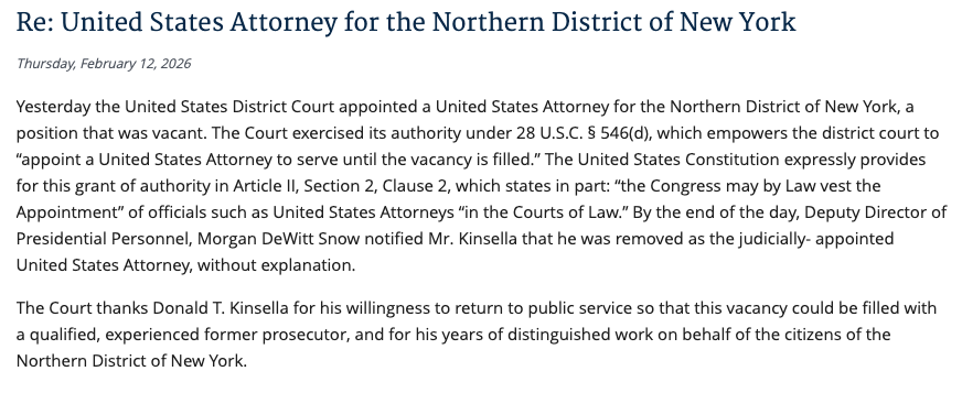 Image Credit: X screenshot The White House promptly nixed the appointment of an attorney hand-selected by a federal court to serve the Northern District of New York earlier this week, asserting the power to appoint attorneys representing federal districts is vested solely in the president.