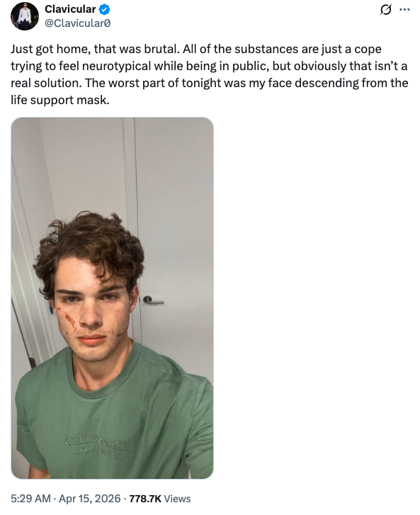 Hours later, Clavicular assured everyone he was ok in a social media update, showing a selfie with bloodstains on his face.