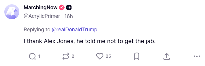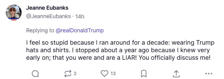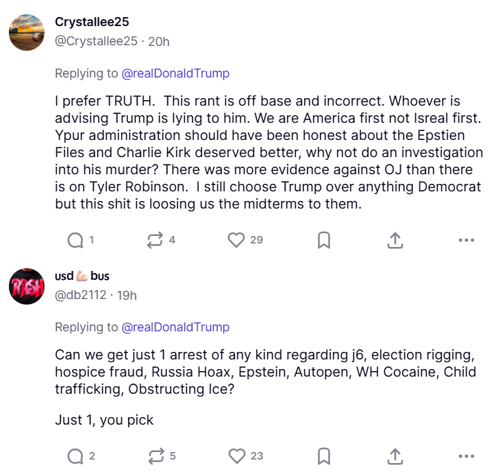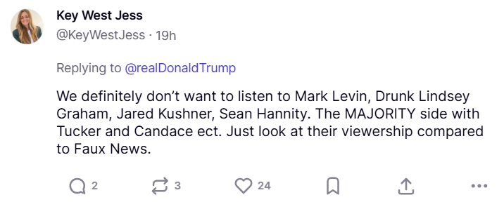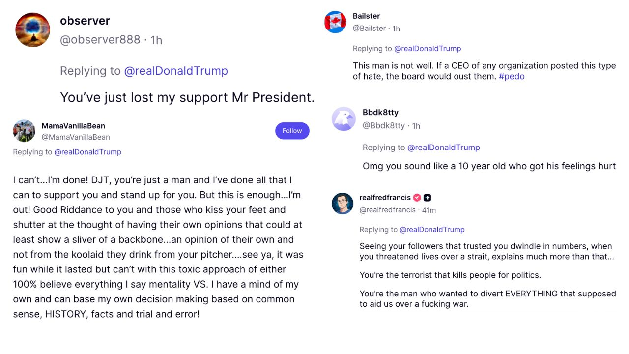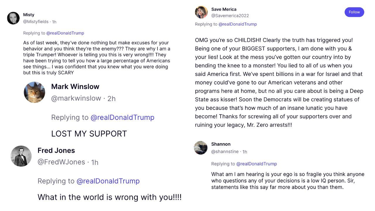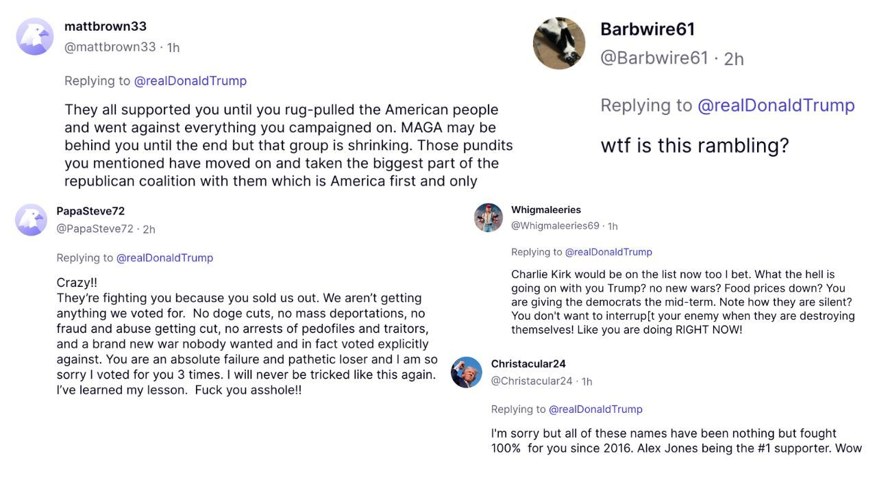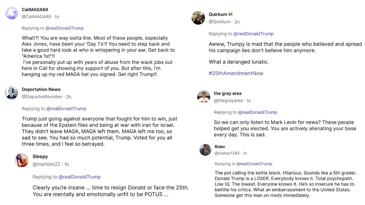 Below is just a sample of thousands of Truth Social users rejecting Trump’s attack on media members who have led the freedom movement for years.
