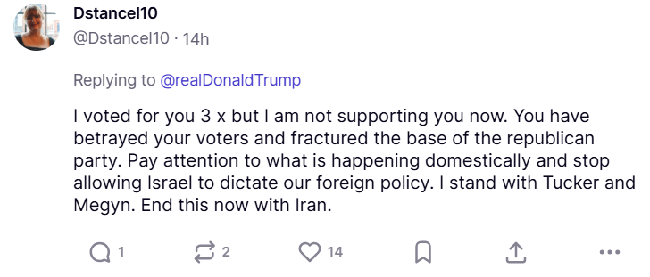 On Wednesday, the New York Times reported that thousands of Trump-supporting Truth Social users also expressed “frustration, disbelief and outrage” at his administration’s handling of the Iran situation.