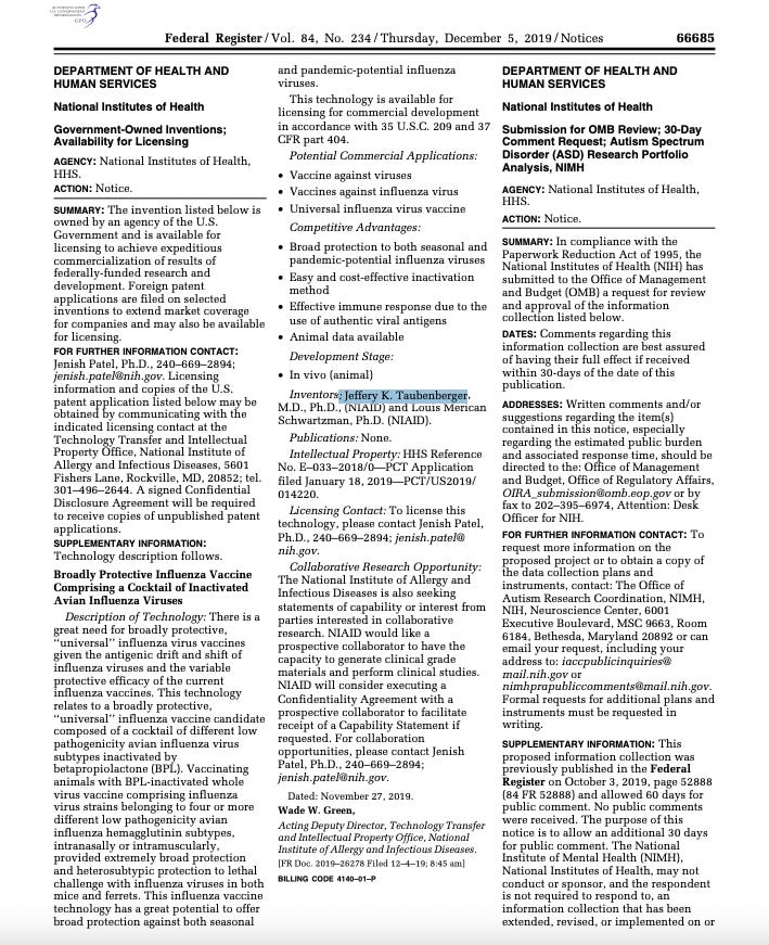 A May 2025 report in Science confirms that NIH “has two patents for the BPL-inactivated, universal flu vaccine,” that Taubenberger “is named as one of the inventors,” and that the NIAID director “stands to financially benefit from this project.”