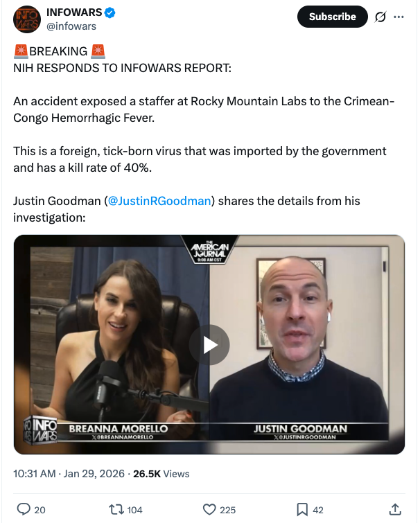 “Within hours of you [Breanna] breaking the story last week about the documents we found showing a lab accident at the Rocky Mountain Laboratory – which is an NIH biolab out in Montana, a high-risk biolab – the NIH admitted publicly that they acknowledged that there was an incident and said that a staffer at this animal laboratory was exposed to Crimean Congo hemorrhagic fever, which is a foreign tick-borne virus that was imported to the United States by the government,” Goodman told Morello.