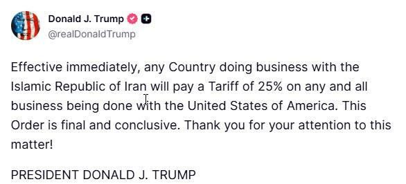 On Monday, POTUS declared a 25% tariff on “any country doing business with the Islamic Republic of Iran.”