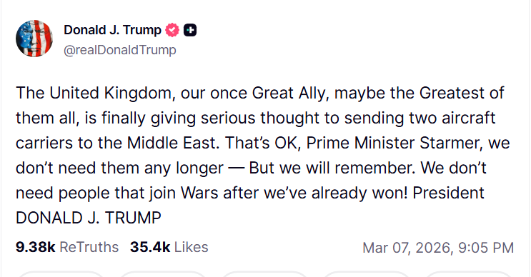 In a post on Truth Social, Trump called Britain “our once Great Ally,” and warned America would remember her failure to provide support in the early stages of the strikes.