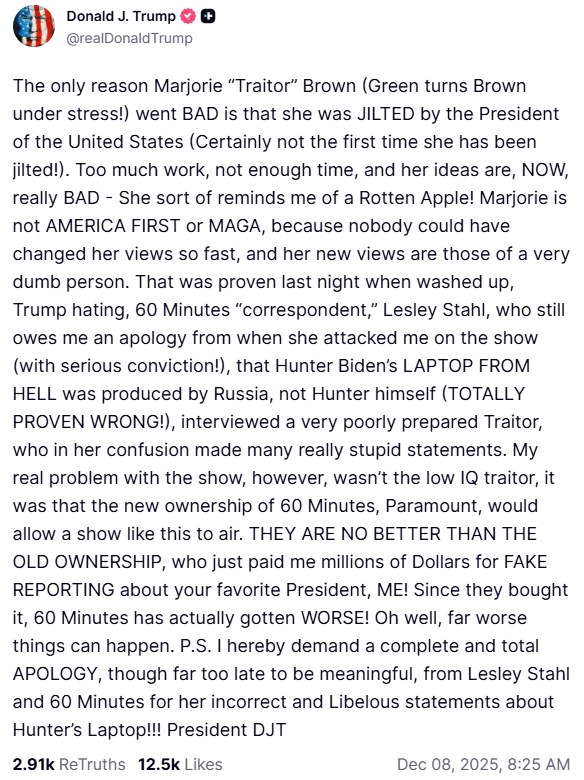 After calling Greene a “poorly prepared traitor” who “made stupid statements,” Trump lashed out at new 60 Minutes owner Paramount for “allowing” the show to air.