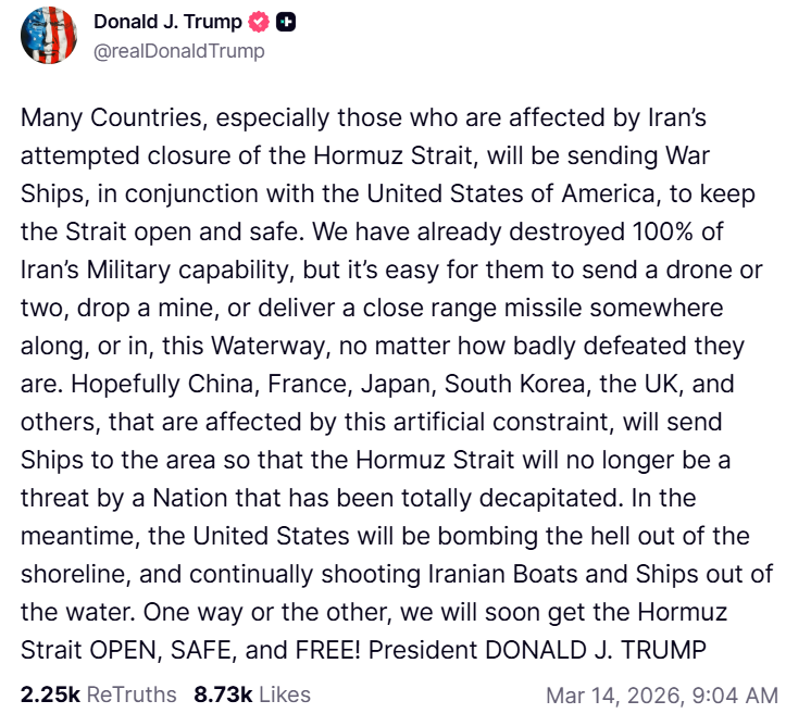 “Many Countries, especially those who are affected by Iran’s attempted closure of the Hormuz Strait, will be sending War Ships, in conjunction with the United States of America, to keep the Strait open and safe,” Trump wrote. “We have already destroyed 100% of Iran’s Military capability, but it’s easy for them to send a drone or two, drop a mine, or deliver a close range missile somewhere along, or in, this Waterway, no matter how badly defeated they are.”