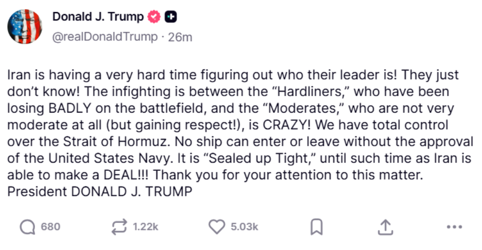 The American military has “total control over the Strait of Hormuz,” according to Trump, who added, “No ship can enter or leave without the approval of the United States Navy. It is ‘Sealed up Tight,’ until such time as Iran is able to make a DEAL!!!”