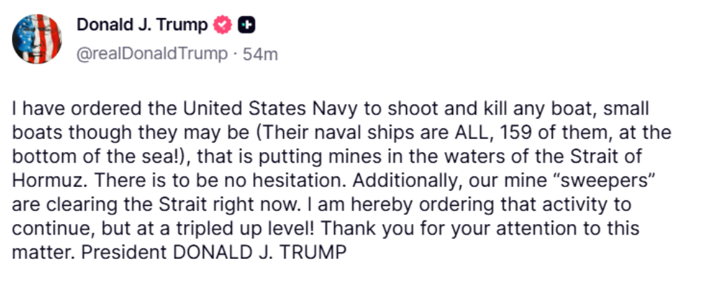 The president first announced he “ordered the United States Navy to shoot and kill any boat, small boats though they may be (Their naval ships are ALL, 159 of them, at the bottom of the sea!), that is putting mines in the waters of the Strait of Hormuz. There is to be no hesitation.”