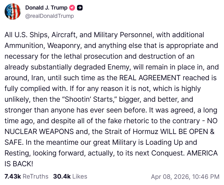After claiming mainstream media outlets shared a “fake” ten-point peace plan between America and Iran, POTUS stated, “All U.S. Ships, Aircraft, and Military Personnel, with additional Ammunition, Weaponry, and anything else that is appropriate and necessary for the lethal prosecution and destruction of an already substantially degraded Enemy, will remain in place in, and around, Iran, until such time as the REAL AGREEMENT reached is fully complied with.”