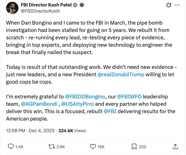 FBI Director Kash Patel likewise praised the Bureau’s work in helping nab the suspect.