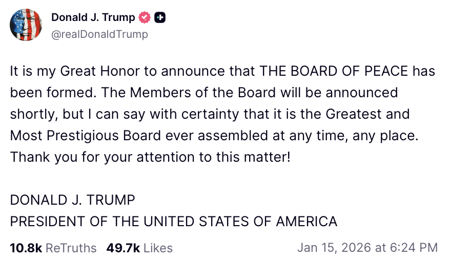 On January 15 Trump announced the formation of a Gaza Board of Peace – a group that will oversee a technocratic committee charged with administering the Gaza Strip during a transitional period, Infowars reported.