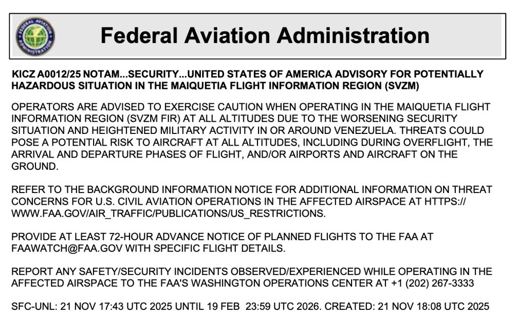 The report comes as the FAA on Friday issued a NOTAM (Notice to Airmen) advising pilots to exercise caution near Venezuela “due to the worsening security situation and heightened military activity.”