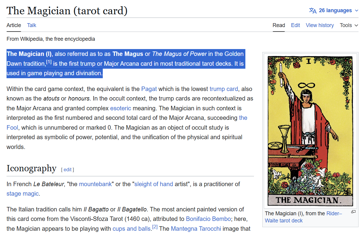 The Wikipedia page for “The Magician tarot card” notes it is “the first trump or Major Arcana card in most traditional tarot decks.”
