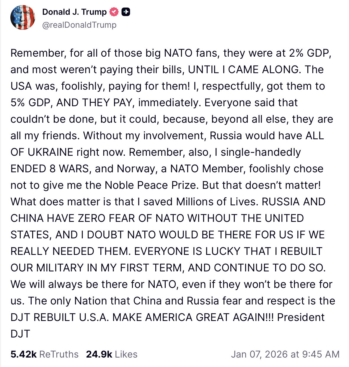 Remember, for all of those big NATO fans, they were at 2% GDP, and most weren’t paying their bills, UNTIL I CAME ALONG. The USA was, foolishly, paying for them! I, respectfully, got them to 5% GDP, AND THEY PAY, immediately. Everyone said that couldn’t be done, but it could, because, beyond all else, they are all my friends. Without my involvement, Russia would have ALL OF UKRAINE right now. Remember, also, I single-handedly ENDED 8 WARS, and Norway, a NATO Member, foolishly chose not to give me the Noble Peace Prize. But that doesn’t matter! What does matter is that I saved Millions of Lives. RUSSIA AND CHINA HAVE ZERO FEAR OF NATO WITHOUT THE UNITED STATES, AND I DOUBT NATO WOULD BE THERE FOR US IF WE REALLY NEEDED THEM. EVERYONE IS LUCKY THAT I REBUILT OUR MILITARY IN MY FIRST TERM, AND CONTINUE TO DO SO. We will always be there for NATO, even if they won’t be there for us. The only Nation that China and Russia fear and respect is the DJT REBUILT U.S.A. MAKE AMERICA GREAT AGAIN!!! President DJT