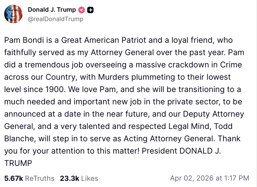 Pam Bondi is a Great American Patriot and a loyal friend, who faithfully served as my Attorney General over the past year. Pam did a tremendous job overseeing a massive crackdown in Crime across our Country, with Murders plummeting to their lowest level since 1900. We love Pam, and she will be transitioning to a much needed and important new job in the private sector, to be announced at a date in the near future, and our Deputy Attorney General, and a very talented and respected Legal Mind, Todd Blanche, will step in to serve as Acting Attorney General. Thank you for your attention to this matter! President DONALD J. TRUMP