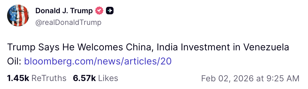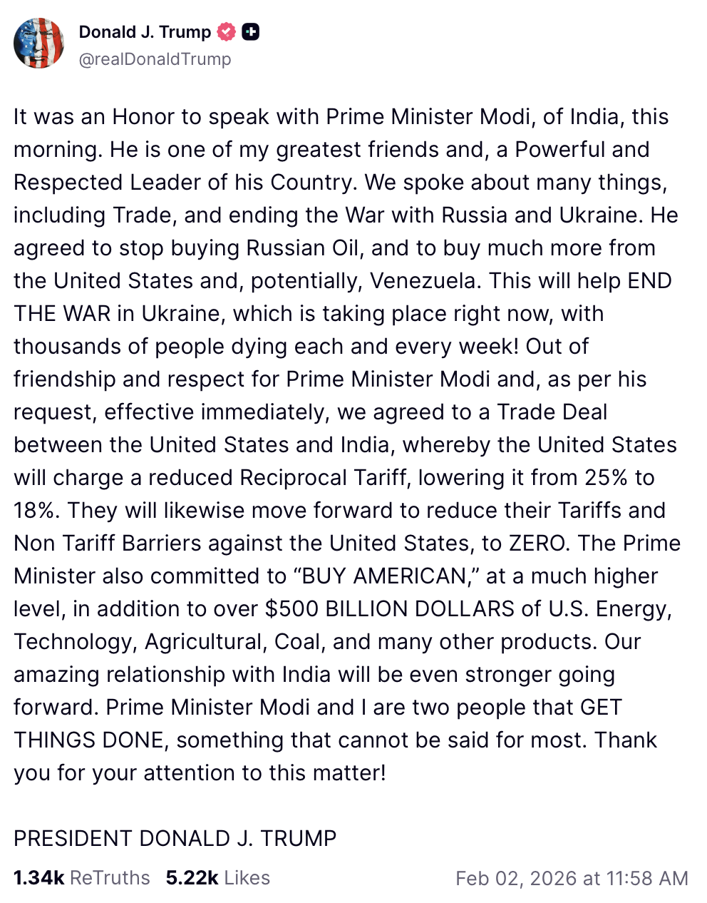 It was an Honor to speak with Prime Minister Modi, of India, this morning. He is one of my greatest friends and, a Powerful and Respected Leader of his Country. We spoke about many things, including Trade, and ending the War with Russia and Ukraine. He agreed to stop buying Russian Oil, and to buy much more from the United States and, potentially, Venezuela. This will help END THE WAR in Ukraine, which is taking place right now, with thousands of people dying each and every week! Out of friendship and respect for Prime Minister Modi and, as per his request, effective immediately, we agreed to a Trade Deal between the United States and India, whereby the United States will charge a reduced Reciprocal Tariff, lowering it from 25% to 18%. They will likewise move forward to reduce their Tariffs and Non Tariff Barriers against the United States, to ZERO. The Prime Minister also committed to “BUY AMERICAN,” at a much higher level, in addition to over $500 BILLION DOLLARS of U.S. Energy, Technology, Agricultural, Coal, and many other products. Our amazing relationship with India will be even stronger going forward. Prime Minister Modi and I are two people that GET THINGS DONE, something that cannot be said for most. Thank you for your attention to this matter!