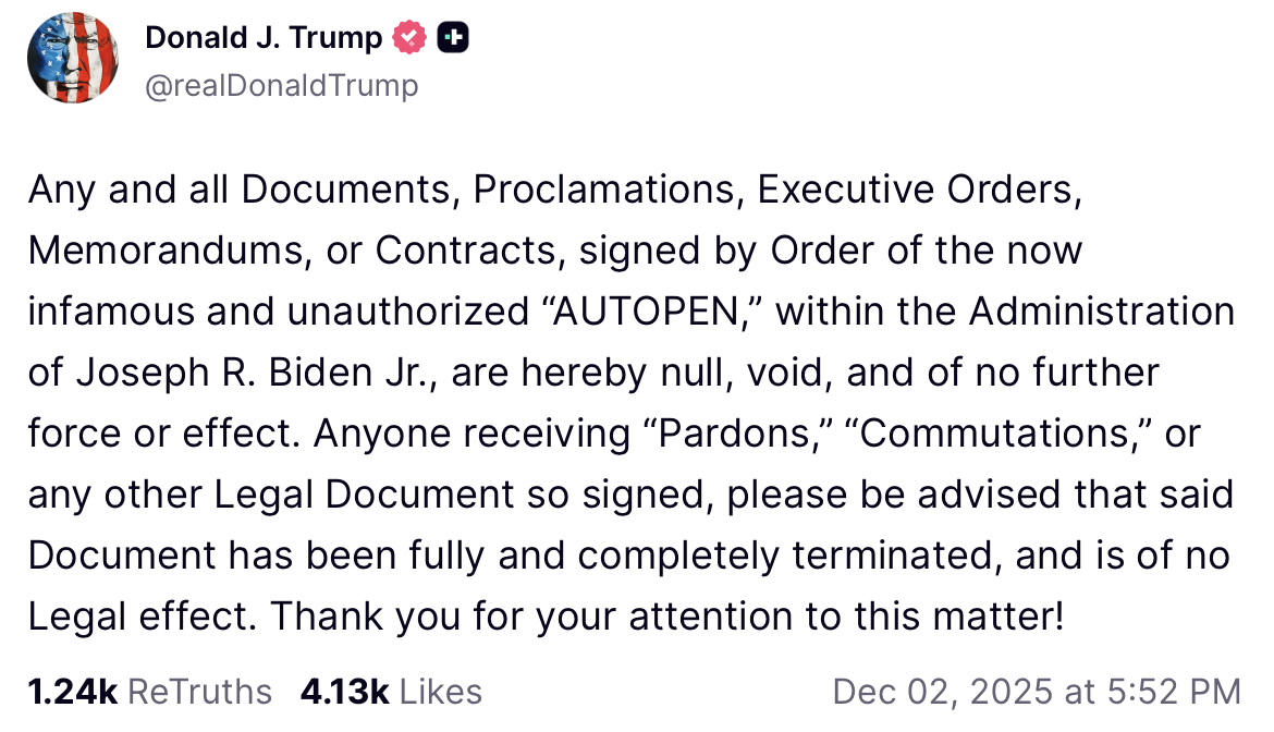 While the decertification included all documents, proclamations, executive orders, memorandums and contracts, Trump went on to specifically discuss the mass pardons issued by President Autopen at the tail end of Biden’s captivity within the White House.