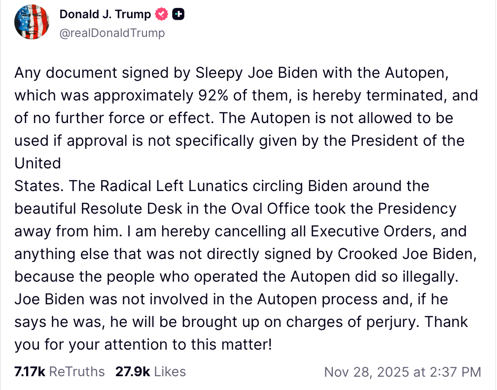 Any and all Documents, Proclamations, Executive Orders, Memorandums, or Contracts, signed by Order of the now infamous and unauthorized “AUTOPEN,” within the Administration of Joseph R. Biden Jr., are hereby null, void, and of no further force or effect. Anyone receiving “Pardons,” “Commutations,” or any other Legal Document so signed, please be advised that said Document has been fully and completely terminated, and is of no Legal effect. Thank you for your attention to this matter!