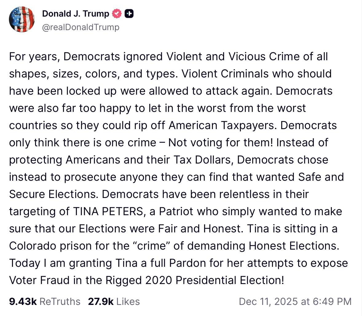 Image Credit: ANDREW CABALLERO-REYNOLDS / Contributor / Getty On Thursday night President Donald Trump announced that he will be issuing a pardon for Tina Peters, “a Patriot who simply wanted to make sure that our Elections were Fair and Honest.” Peters served as a Republican clerk of Mesa, Colorado. In 2024 she was “convicted of participating in a scheme to breach voting systems,” and sentenced to nine years in prison due to exposing election fraud she had evidence to.