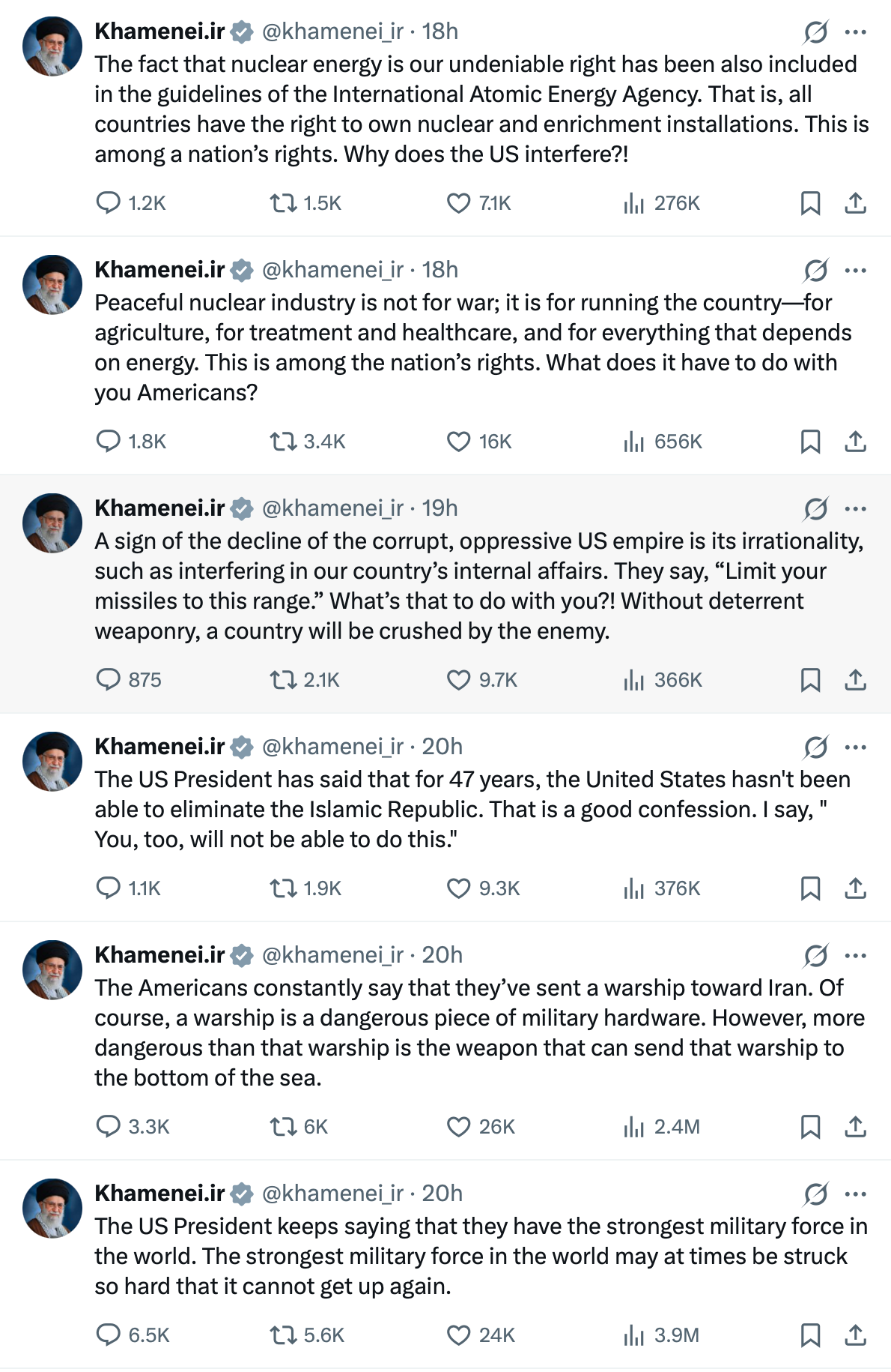 The Dictator of Iran, Ali Khamenei, took a much more belligerent tone. The Dictator went so far as to threaten the U.S. on Tuesday, although the irate posts on his social media seem to have ceased following his barrage of harsh language Tuesday.
