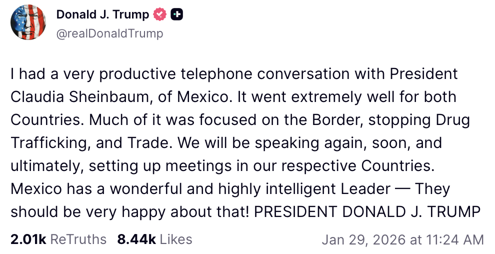 Regarding anti-drug policies, Trump may have been playing the ‘good cop’ while on his Thursday call, after playing the ‘bad cop’ over the last several months. The capture of Maduro likely catalyzed this positive change of tone by showing Sheinbaum that the U.S. is willing to use force when diplomacy fails.