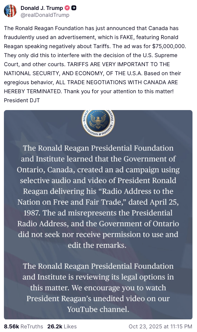 Trump posted a statement by The Ronald Reagan Foundation regarding the deceitful Canadian propaganda operation: