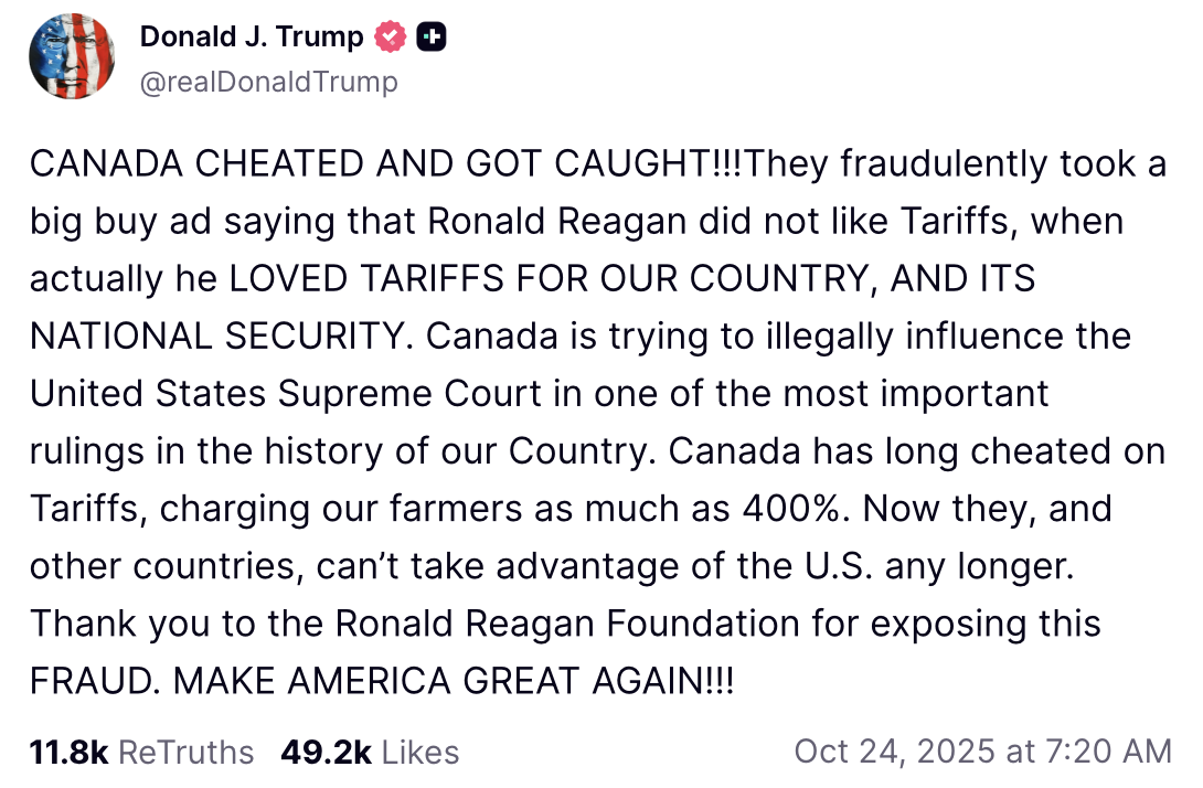 CANADA CHEATED AND GOT CAUGHT!!!They fraudulently took a big buy ad saying that Ronald Reagan did not like Tariffs, when actually he LOVED TARIFFS FOR OUR COUNTRY, AND ITS NATIONAL SECURITY. Canada is trying to illegally influence the United States Supreme Court in one of the most important rulings in the history of our Country. Canada has long cheated on Tariffs, charging our farmers as much as 400%. Now they, and other countries, can’t take advantage of the U.S. any longer. Thank you to the Ronald Reagan Foundation for exposing this FRAUD. MAKE AMERICA GREAT AGAIN!!!