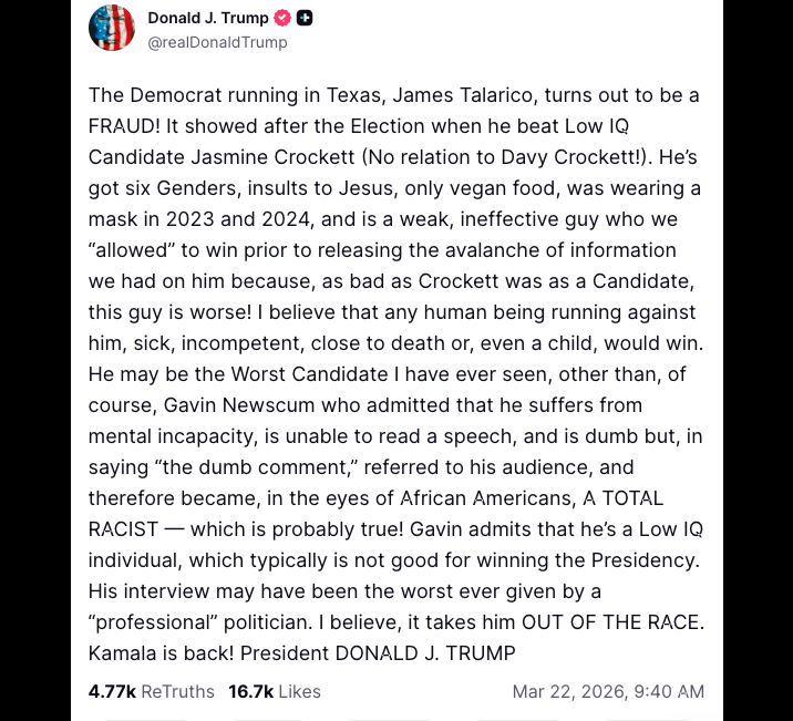 “The Democrat running in Texas, James Talarico, turns out to be a FRAUD! It showed after the Election when he beat Low IQ Candidate Jasmine Crockett (No relation to Davy Crockett!).”
